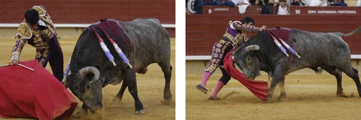 2º) Un buen tercio de varas protagonizó el segundo victorino, cárdeno, largo y de acapachada cornamenta. Fue al caballo desde lejos en las dos ocasiones, empujando con fuerza. No fue fácil el de Victorino, que se quedaba siempre a mitad del viaje sabiendo lo que se dejaba atrás. Alberto Aguilar estuvo muy valiente con el toro, sin dejarse ganar la partida nunca. En un descuido, fue prendido sin consecuencias. La faena se vivió entre el ¡ay! Y el ¡olé!. La estocada cayó baja y necesito descabellar. Se resistió el presidente pero al final concedió la oreja. OREJA
