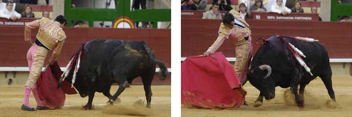 6º) El sexto, de Cuadri, realizó una tímida pelea en varas. En banderillas cogió a Alberto Martínez, propinándole una fuerte paliza y sufriendo aparentemente una cornada. Está siendo atendido en la enfermería en estos momentos. El toro tuvo nobleza y Pinar lo entendió bien, toreando por momentos con buenas maneras. Más reposado estuvo el torero frente a este Cuadri. Mató de una estocada algo caída que tuvo un rápido efecto y que propició que la gente pidiera la oreja con insistencia. La concedió el usía y el de Albacete también abrió la puerta grande. OREJA