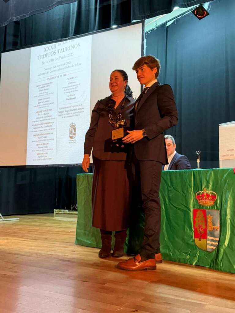 Un galardón que recibió de manos de Belén Rodríguez, alcaldesa de esta localidad madrileña. Serrano, novillero ganador del Circuito de Novilladas de la Comunidad de Madrid, suma este galardón a la nómina de los conseguidos la pasada temporada como el trofeo al mejor de la feria de novilladas de Guadarrama o el V Judión de Oro de La Granja.