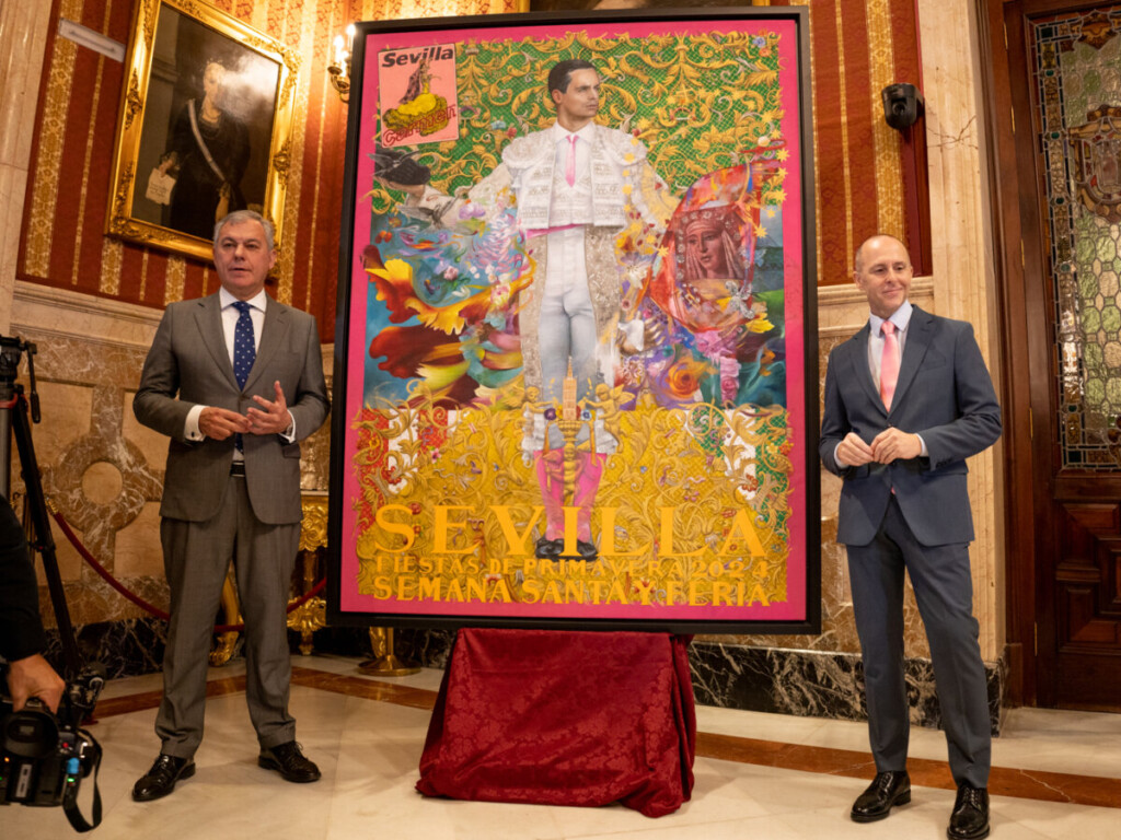 Se trata de un cartel en el que el toreo está muy presente siendo el eje central de una composición con mucha esencia sevillana con referencias como el manto de malla de la Esperanza Macarena, la Esperanza de Triana o el Simpecado de la Amargura, aunando así las grandes fiestas de la capital hispalense.