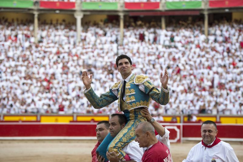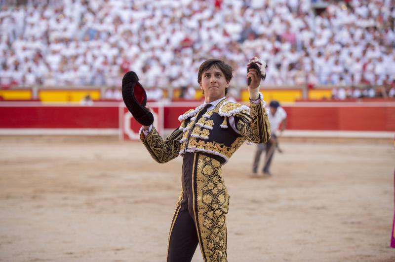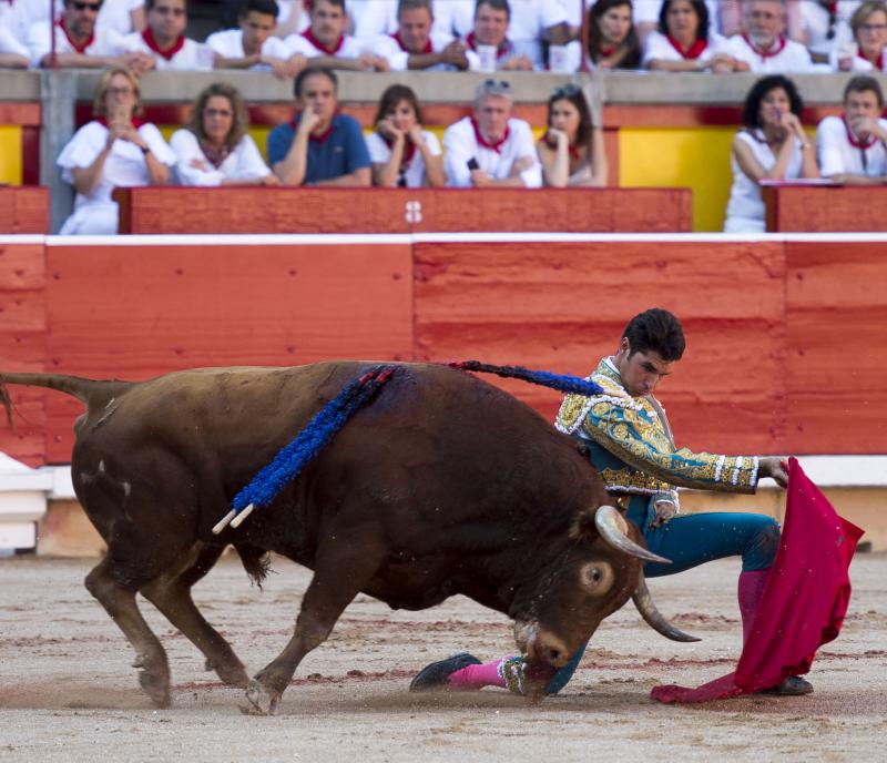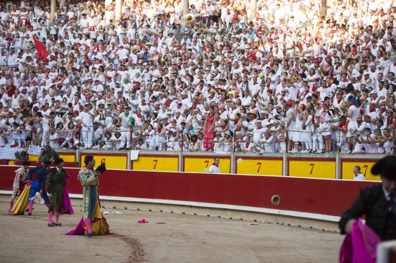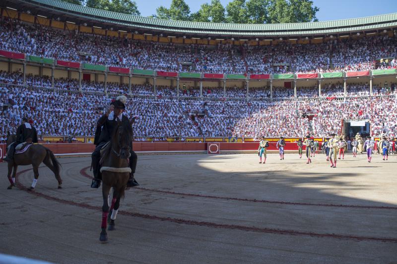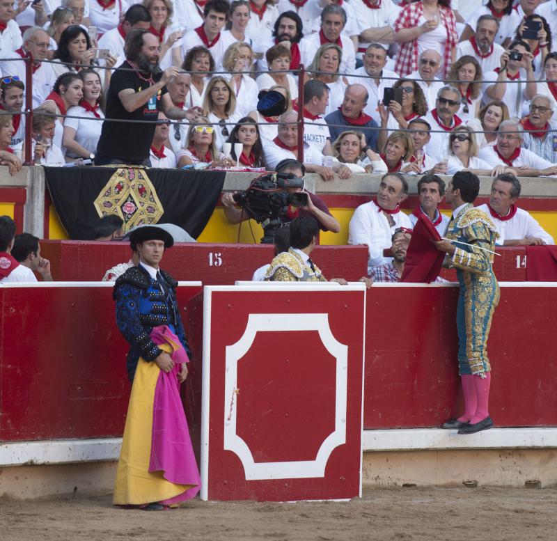 Pamplona, martes 11 de julio de 2017. Toros de Jandilla y Vegahermosa (1º). Bien presentado y de buen juego en líneas generales. Destacó el 6º. Miguel Ángel Perera, silencio y ovación con saludos; Cayetano, oreja con fuerte petición de la segunda y oreja; Roca Rey, oreja y oreja que recogió su subalterno Juan José Domínguez. Entrada: Lleno de "No hay billetes". Saludaron tras parear al 5º Iván García y Alberto Zayas.