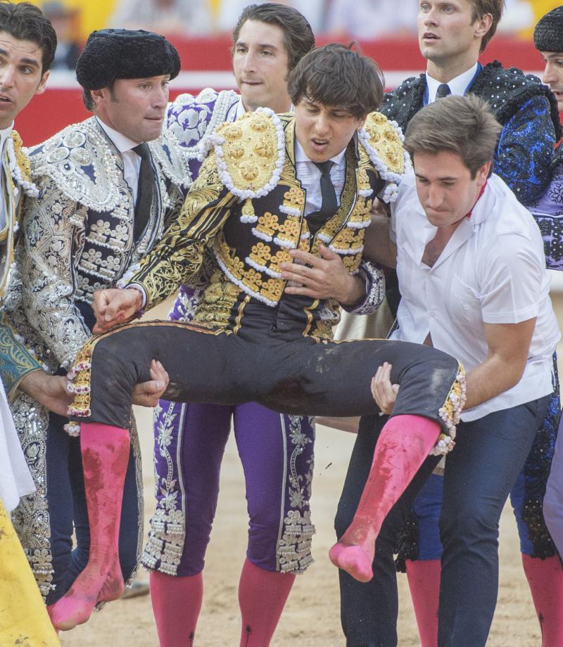 El jabonero sexto se arrancó bien al caballo de picar y resultó bravo, pronto y alegre en el último tercio. Roca Rey, que cuajó un buen quite por saltilleras cambiando el viaje del animal, arrancó con estatuarios la faena de muleta, quieto como un poste. Le obligó bien a derechas el peruano, especialmente en las primeras series. Codicioso resultó el jandilla por el pitón izquierdo, por donde el acople fue menor. A la labor, en general, le faltó mayor contundencia en el toreo fundamental, pero sobresalió de nuevo en las distancias cortas que pisó al final. Fue cogido al entrar a matar, siendo herido en el suelo en la parte interna del muslo izquierdo. El torero empujó con fuerza la empuñadura de la espada, que se rompió en el encuentro con el toro. Roca Rey fue conducido por las asistencias a la enfermería, siendo su banderillero Juan José Domínguez quien se encargó de llevarle a la enfermería el trofeo concedido.