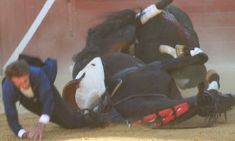 Chenel, caballo estrella de la cuadra de Pablo Hermoso de Mendoza, ha sufrido un percance cuando galopaba de costado en la lidia del primer toro del festejo celebrado en la plaza de toros de Ejea de los Caballeros. El equino tropezó y el caballero navarro cayó al suelo viviéndose instantes de enorme angustia. El caballo en el suelo, Hermoso de Mendoza enganchado al estribo sin poder salir y el toro empujando con los pitones a la barriga del caballo. Fueron varios minutos de enorme tensión con cinco subalternos coleando y sin poder desplazar al toro del caballo.