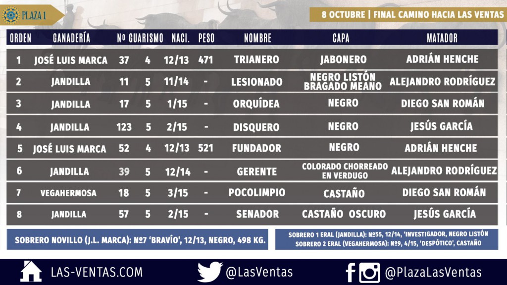 En Las Ventas se encuentra todo a punto para que se celebra la Final Camino hacia Las Ventas 2017. En chiqueros aguardan dos utreros de Jose Luis Marca que serán lidiados por Adrián Henche, y cinco erales de Jandilla y uno de Vegahermosa que ya han sido sorteados y que serán lidiados por los finalistas del ciclo, los novilleros Alejandro Rodríguez, Diego San Román y Jesús García. Se ha reseñado un sobrero de José Luis Marca y para la final, el primer sobrero será del hierro de Jandilla y el segundo de la ganadería de Vegahermosa. El festejo comienza a las 17 horas y el orden de lidia establecido es el siguiente: