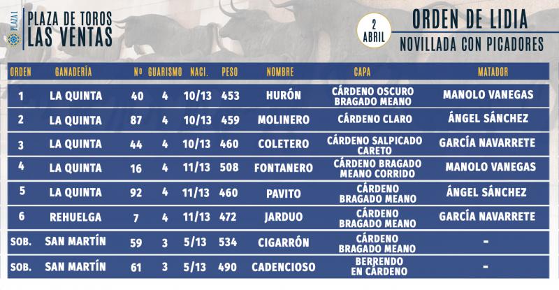 Cinco novillos de La Quinta y un remiendo de Rehuelga, de encaste Santa Coloma, han sido sorteados para la segunda novillada de la temporada 2017 en Las Ventas. Los sobreros pertenecen a la ganadería de San Martín. Harán el paseíllo los novilleros Manolo Vanegas; Ángel Sánchez, que se presenta; y García Navarrete, que también debuta en esta plaza. El festejo dará comienzo a las 18 horas.