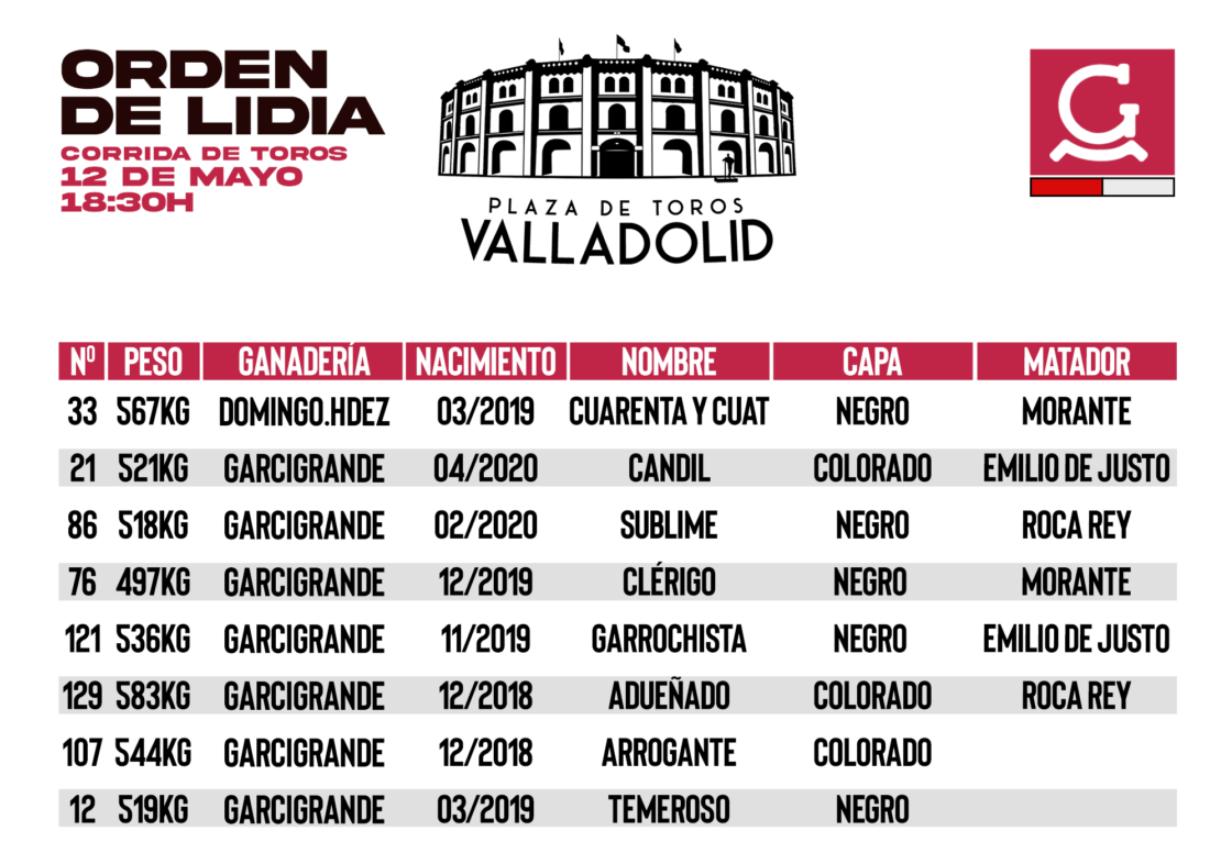 Cinco toros de Garcigrande y uno de Domingo Hernández (1º) esperan en los corrales de la plaza de Valladolid para la segunda de la Feria de San Pedro Regalado. Morante de la Puebla, Emilio de Justo y Roca Rey harán el paseíllo. El orden de lidia es este: