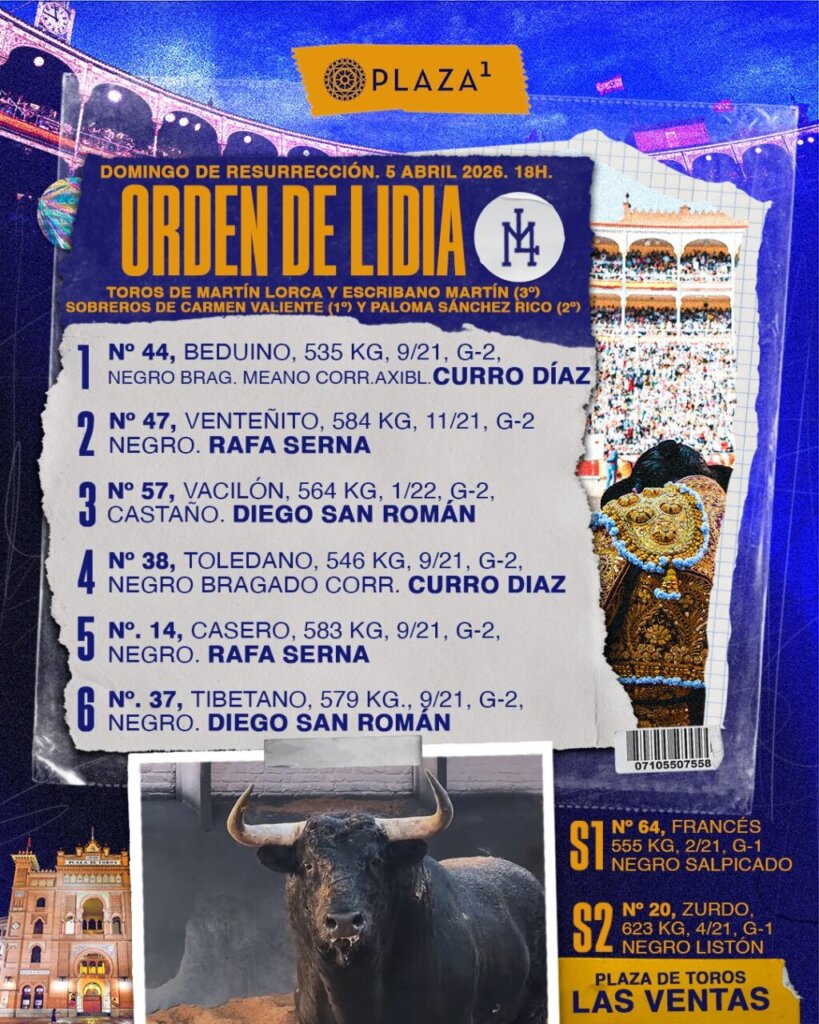 Cinco toros de Martín Lorca y uno de Escribano Martín aguardan ya en los corrales de Las Ventas para la cita del Domingo de Resurrección. Curro Díaz, Rafa Serna y Diego San Román harán el paseíllo. Este es el orden de lidia: