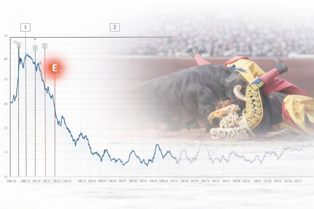 Registro de la frecuencia cardíaca durante la lidia al primer toro de la tarde, cuando el animal hiere al torero, y hasta el comienzo de la segunda lidia después de la operación. El punto "E" de color rojo representa el momento de la cornada.