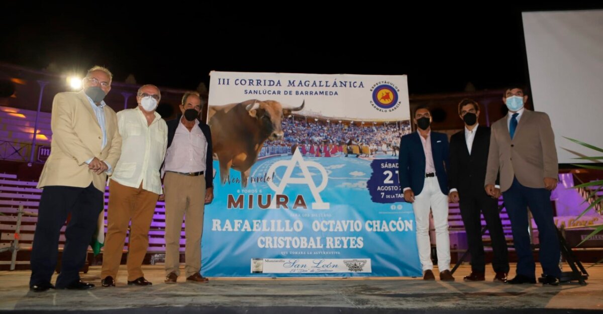 Caía la noche sobre el coso de El Pino al mismo tiempo que se presentaba la ya tradicional corrida Magallánica de Sanlúcar de Barrameda. Este año, el empresario Carmelo García ha añadido el aliciente de introducir una alternativa, la del novillero Cristóbal Reyes, que se verá anunciado el próximo día 21 de agosto junto a Rafaelillo y Octavio Chacón que harán las funciones de padrino y testigo respectivamente. El ruedo de la plaza, como viene siendo habitual, se decorará con la maravillosa alfombra de sal magallánica.