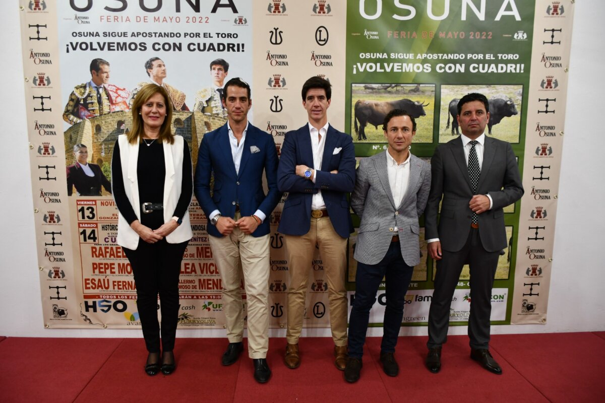 La Casa de la Cultura de la localidad de Osuna acogió este jueves la presentación de los carteles de la feria de 2022. El acto fue presidido por la alcaldesa de la localidad, Rosario Andújar, y contó con la asistencia del empresario Antonio Osuna, los matadores de toros Rafaelillo, Pepe Moral y Esaú Fernández, así como los ganaderos de Cuadri y Benítez Cubero.