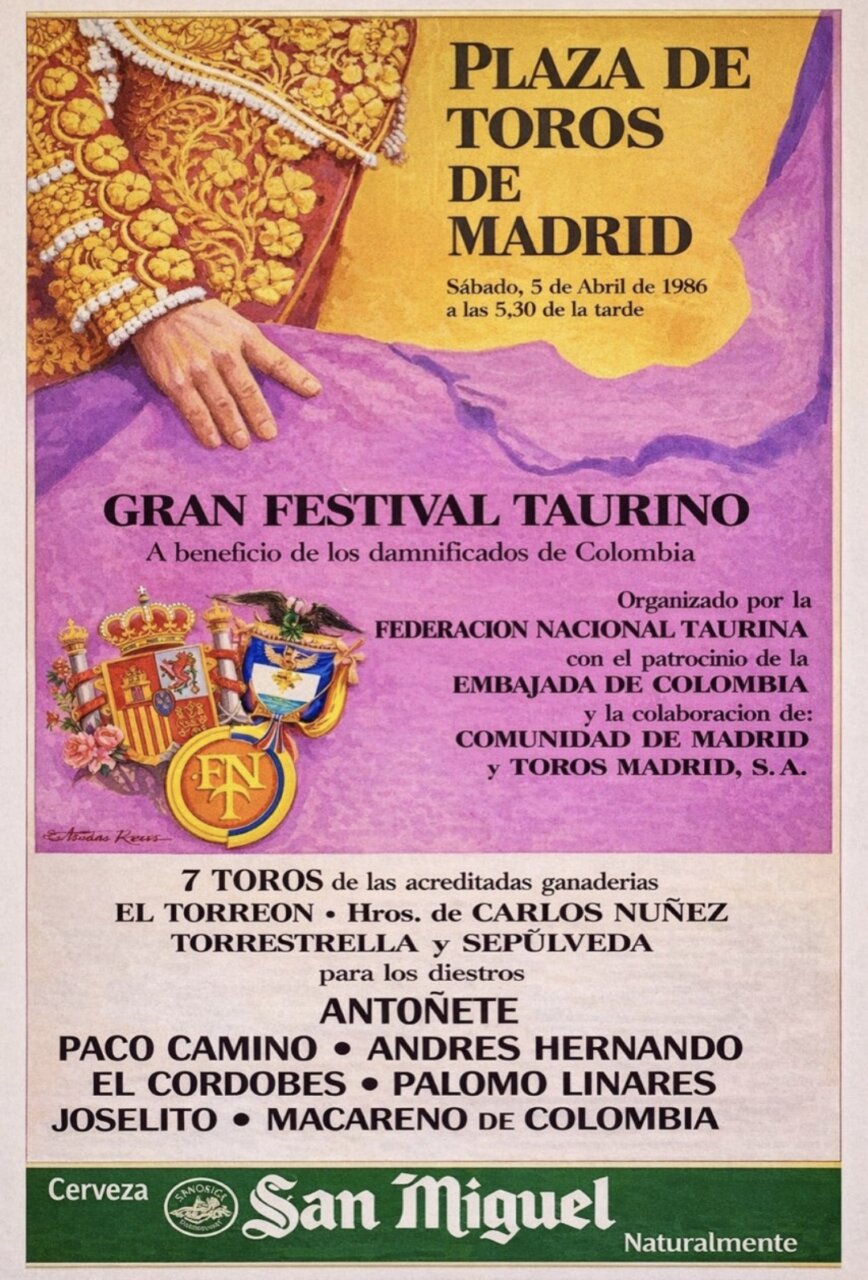 La erupción del volcán Nevado del Ruiz el 13 de noviembre de 1985 causó una enorme tragedia en los pueblos colombianos de Armero y Chinchibá, donde murieron más de veintitrés mil personas. Como tantas veces ocurre ante las desgracias, el mundo del toro estuvo del lado de los que más lo necesitan y se organizó -con la ayuda de la Federación Nacional Taurina, el patrocinio de la embajada de Colombia y la colaboración de la Comunidad de Madrid y la empresa Toros Madrid- un festival en Las Ventas para paliar en la medida de lo posible el drama que había ocasionado tan terrible catástrofe.
