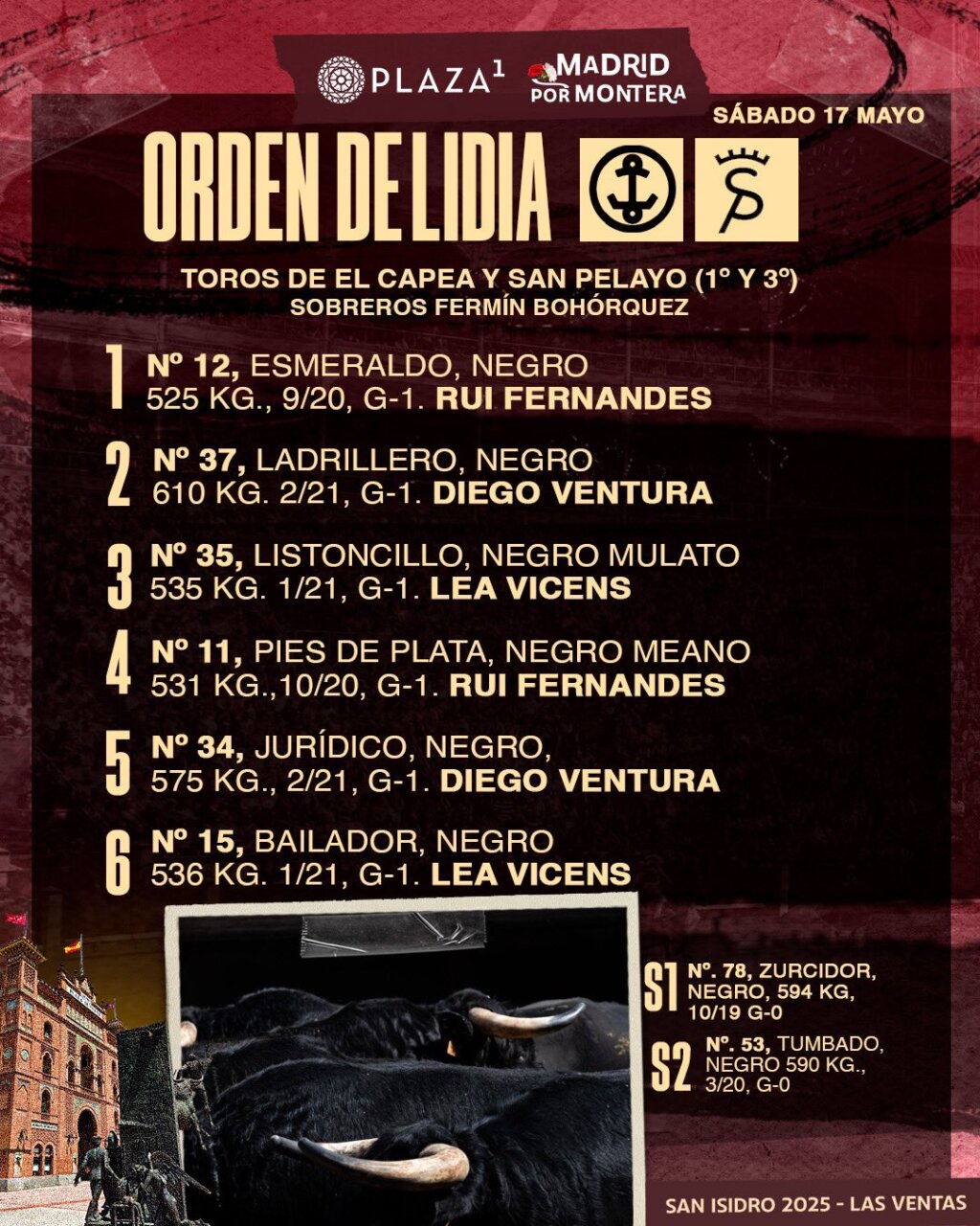Cuatro toros de El Capea y dos de San Pelayo (1º y 3º) han sido sorteados y enchiquerados en los corrales de la plaza de toros de Las Ventas para el festejo de rejones de esta tarde en Madrid. Rui Fernandes, Diego Ventura y Lea Vicens harán el paseíllo a partir de las 19:00 horas. El orden de lidia es el siguiente: