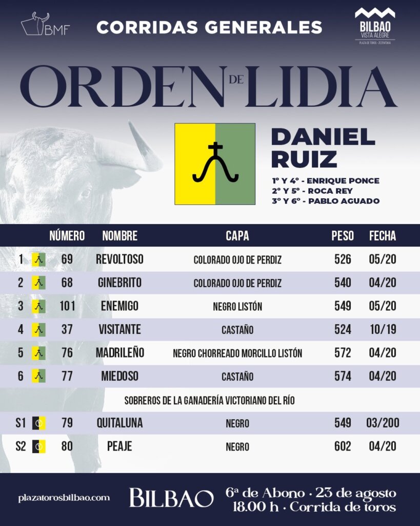 Los toros de Daniel Ruiz han sido sorteados en los corrales de Vista Alegre para la esperada despedida de Enrique Ponce de Bilbao, un cartelazo en el que hará el paseíllo con Roca Rey y Pablo Aguado.