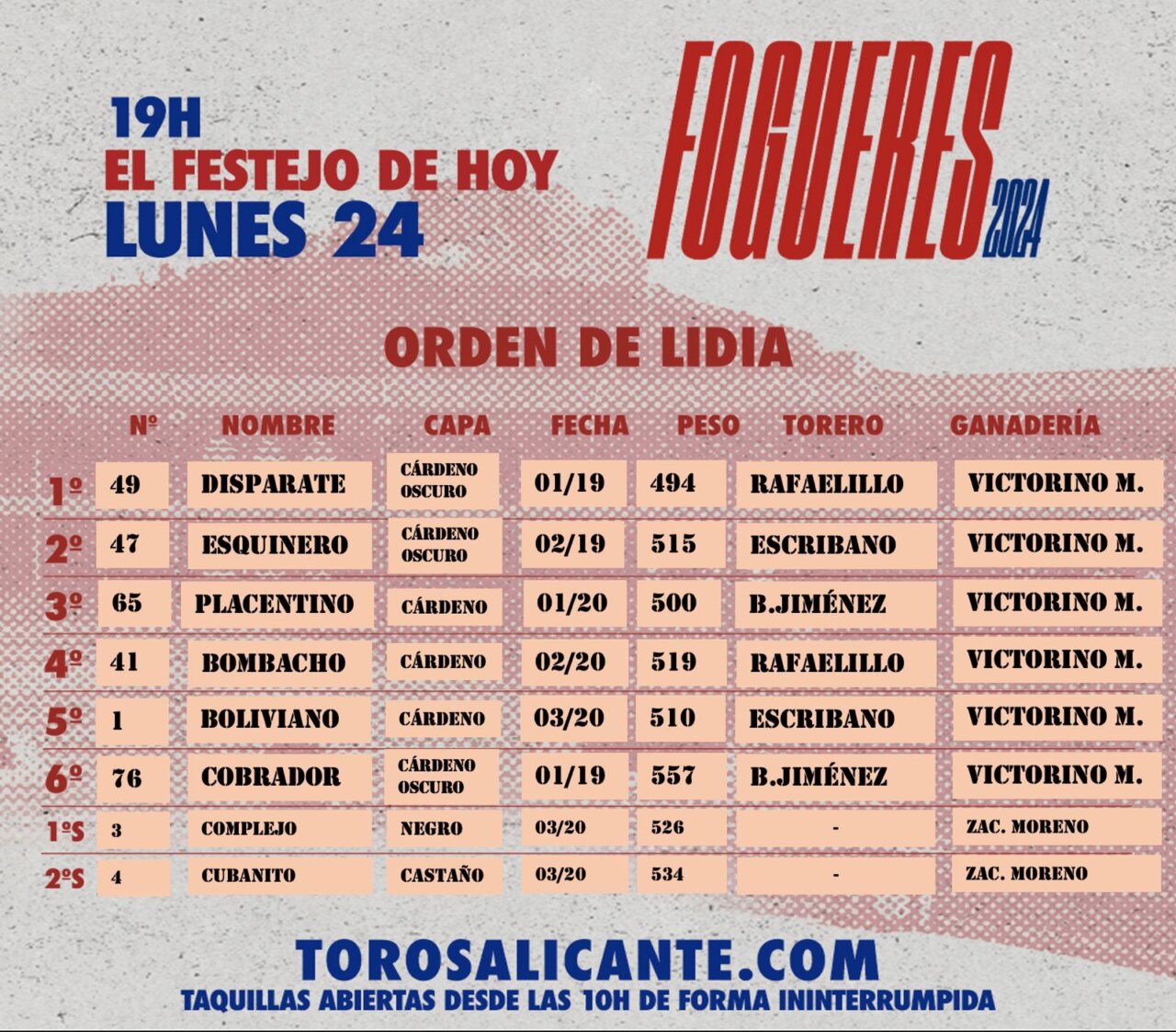 Seis toros de Victorino Martín han sido sorteados y enchiquerados en los corrales de la plaza de toros de Alicante para ser lidiados en el último festejo de la Feria de Hogueras. Rafaelillo, Manuel Escribano y Borja Jiménez cierran a partir de las 19:00 el abono. El orden de lidia es el siguiente: