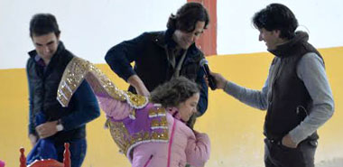 La otra gran alegría de la jornada fue la presencia de David Mora, quien, junto al diestro local Sergio Serrano, participó también de la iniciativa enseñando a los niños y niñas a torear de salón, e incluso, a vestirse de luces.