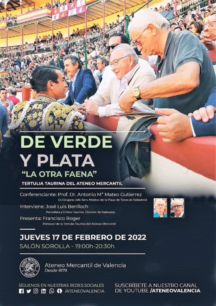 El próximo 17 de febrero, el salón Sorolla del Ateneo Mercantil de Valencia acogerá la tertulia "De verde y plata; la otra faena", impartida por el ex cirujano jefe de la plaza de toros de Valladolid, el doctor Antonio María Mateo Gutiérrez.