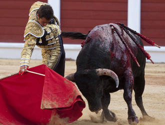 7º) El sobrero de San Pelayo que regaló Diego Ventura fue manejable y ante él, quebró con espectacularidad en un tercio de banderillas de mejor ejecución que colocación de farpas. Quebró siempre con ceñimiento y calentó los tendidos, sobre todo con Califa con el que clavó tres rosas y se adornó en el desplante del teléfono. Tras un rejonazo desprendido, tuvo que echar mano del verduguillo en una ocasión. El público pidió con fuerza una segunda oreja que el palco no concedió, decisión que desató una fuerte bronca por parte del respetable. OREJA CON FUERTE PETICIÓN DE LA SEGUNDA