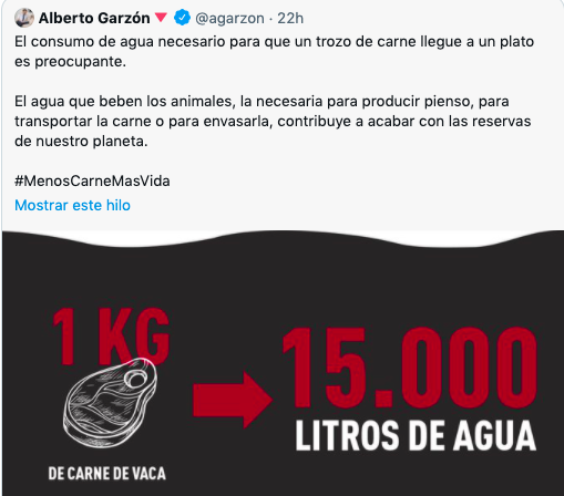 En su intervención, Alberto Garzón animaba a la población a reducir el consumo de carne apelando a su impacto negativo sobre la salud y sobre el medio ambiente. Según argumentaba, "el consumo de agua necesario para que un trozo de carne llegue a un plato es preocupante", y situaba en 15.000 los litros de agua necesarios para producir 1 kilo de carne. Lo publicaba así en su cuenta de Twitter: