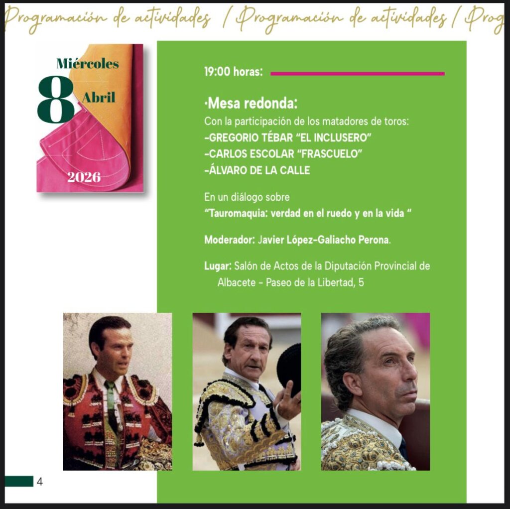 Esta tarde, a las 19:00 horas, el salón de actos de la Diputación de Albacete acoge la mesa redonda "Tauromaquia: verdad en el ruedo y en la vida", con la participación de los matadores Gregorio Tébar "El Inclusero", Carlos Escolar "Frascuelo" y Álvaro de la Calle, moderados por Javier López-Galiacho.