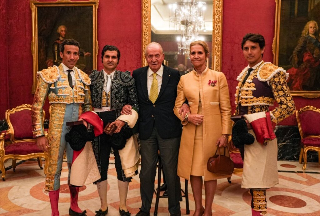 Tras la corrida de Resurrección de Sevilla, hubo una recepción del Rey Emérito Don Juan Carlos I con los actuantes de la tarde, Morante, Roca Rey y David de Miranda. Todos posaron para la posteridad junto a la Infanta Elena, que también asistió al histórico festejo.
