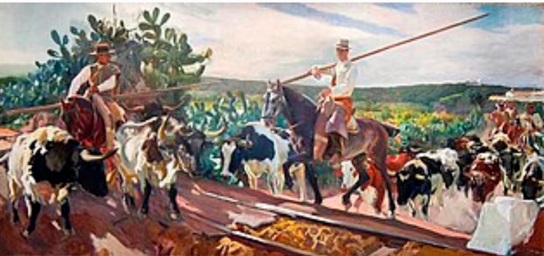 El cuadro “El encierro”(1914) describe una escena de lo más campera: mayorales, dos garrochistas en primer plano, y otros tres al fondo, conducen a los toros hacia los cercados, pastos o a un punto de embarque, a través de un camino rural, paraje de pitas y chumberas que bordean el camino de tierra y las vías del ferrocarril. La escena parece situarse en la finca Las Delicias, que se atribuye a la familia Miura.