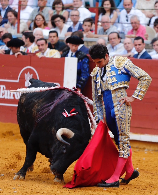 El quinto, muy descastado, duró dos tandas soberbias con la derecha. Lo recibió con buenas verónicas Finito de Córdoba. La faena no prosperó porque se apagó el de Juan Pedro. Dos pinchazos y estocada trasera. Saludos.