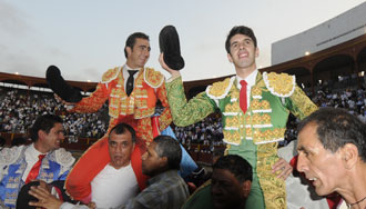 Enrique Ponce y Miguel Ángel Perera han cortado dos orejas en el festejo celebrado en Lima y han salido a hombros de la plaza de toros de Acho. Sebastián Castella, con el peor lote, se fue de vacío.