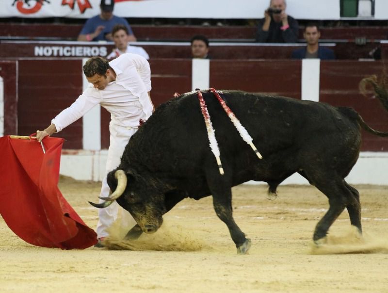 Salió a matar el último Antonio Ferrera, vestido de paisano y con la montera calada, dejando detalles de torería con el capote frente al de Gutiérrez. Saludaron Ricardo Santana y Wilson Chaparro en banderillas. Brindó al equipo médico de la plaza, que minutos antes lo había intervenido. Desde el inicio de rodillas la faena tuvo intensidad y el público a favor. El toro humilló con codicia aunque sin mucha clase. Ferrera apostó fuerte y durante toda la faena expuso los muslos quedando al filo de la cornada. Todo el repertorio de Ferrera a la orden del día, incluida la estocada caminando. Siete pasos hasta volcarse con la espada. Falló con el descabello y el aviso sentenció el balance.