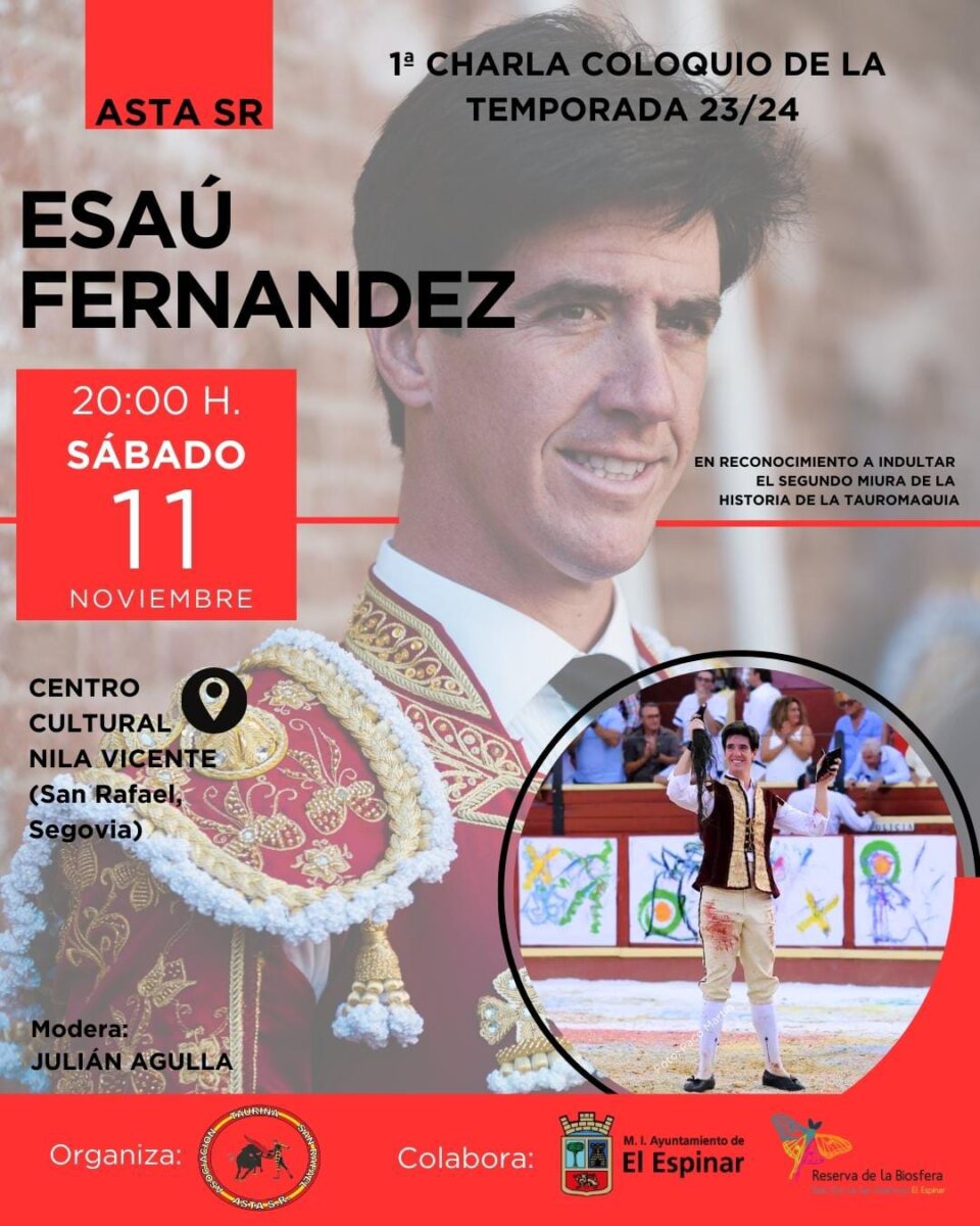 El diestro sevillano Esaú Fernández será el protagonista de la primera charla de la temporada 2023/2024 de la localidad segoviana de San Rafael el próximo 11 de noviembre. Moderado por nuestro compañero Julián Agulla, el hispalense hablará en reconocimiento a indultar el segundo Miura de la historia de la tauromaquia el pasado 20 de agosto en la Corrida Magallánica de la localidad gaditana de Sanlúcar de Barrameda y además se le hará entrega de un premio o reconocimiento por haber logrado perdonar la vida al segundo miura de toda su historia ganadera.