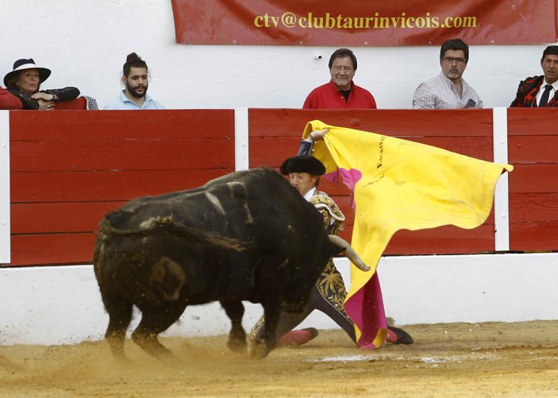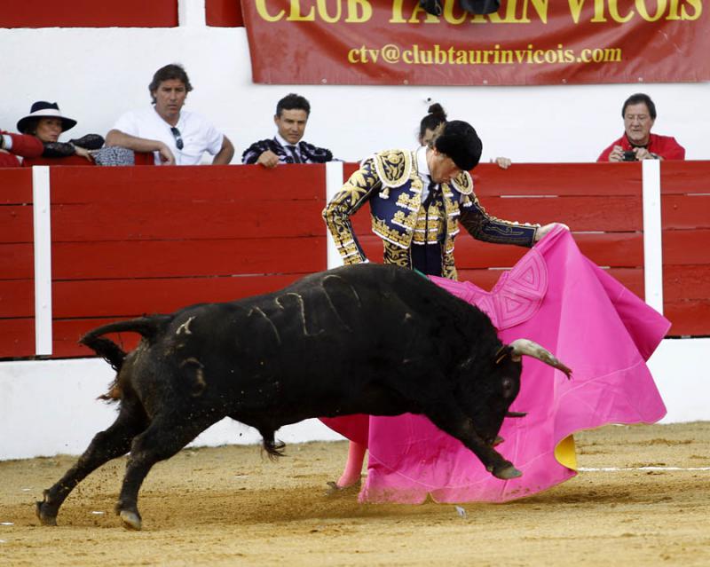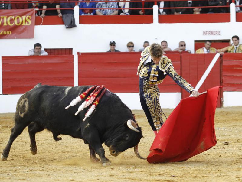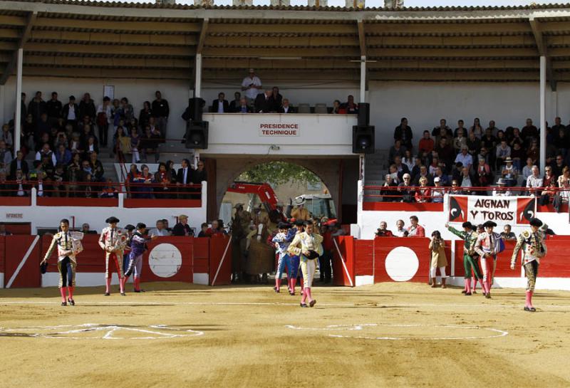 Aignan (Francia). Toros de Gallon (1º, 3º y 5º) y Camino de Santiago (2º, 4º, premiado con la vuelta al ruedo, y 6º), dispares de presentación y de juego, poco castigados en varas. Nobles pero sosos y escasos de fuerzo los cinqueños de Gallon, con más cuajo aunque justos de fuerza los de Camino de Santiago, nobles, superior el cuarto en la muleta. Manuel Escribano, silencio y dos orejas; Iván Fandiño, oreja y silencio; Emilio de Justo, palmas y oreja. Entrada: Tres cuartos. Indicendias: vuelta al ruedo del cuarto toro "Ternero" de Camino de Santiago, nº 92 nacido en junio de 2012, negro.