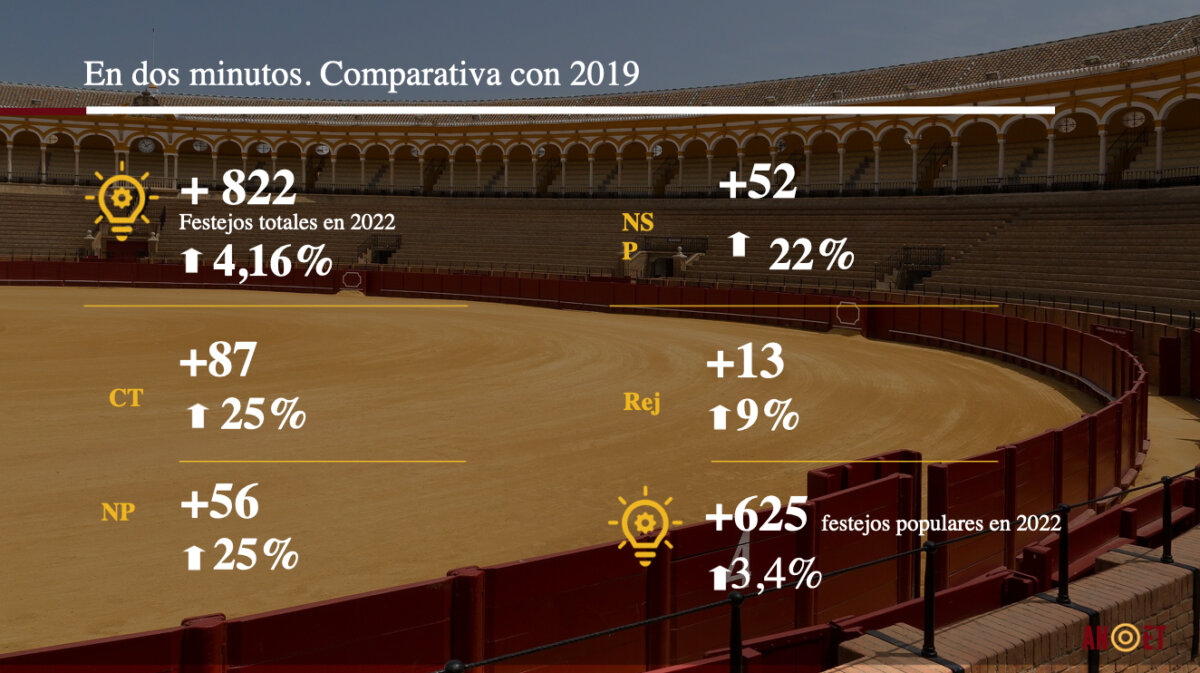 Atendiendo a los números globales del informe, en la temporada 2022 hubo un incremento de 822 festejos, desglosados de este modo: 87 corridas de toros más, 56 novilladas picadas, 52 novilladas sin picadores,13 festejos de rejones y 625 populares.