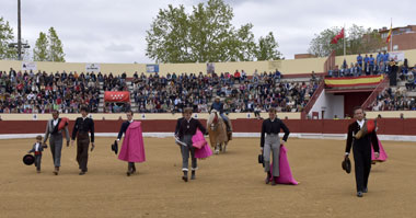 Antes, en los alrededores de la plaza, desde las 11:00h, hubo una exhibición de toreo de salón a cargo de los Aficionados Prácticos de Móstoles en la que participaron una gran cantidad de niños de ambas localidades. Un aperitivo a lo que fue el tentadero de después.