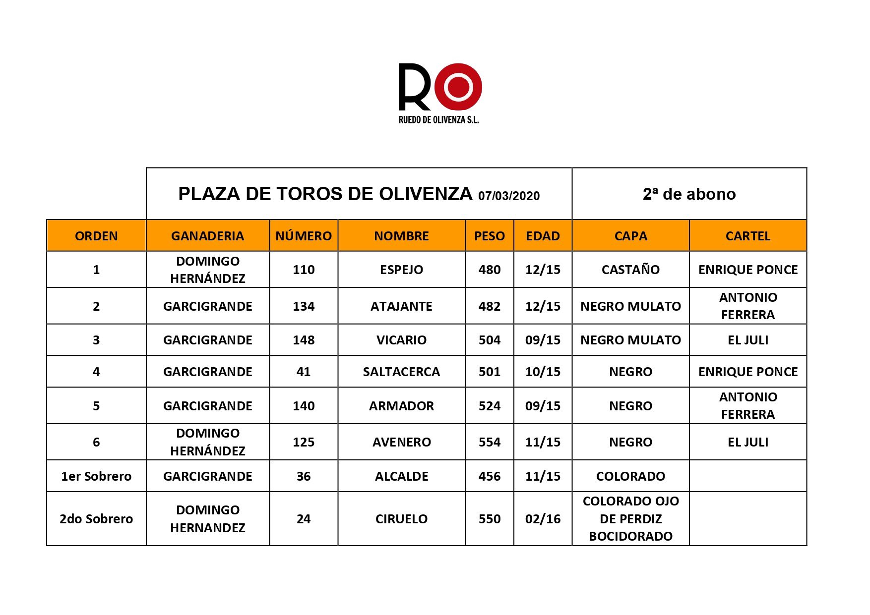 Cuatro toros de Garcigrande y dos de Domingo Hernández -los que abren y cierran la tarde- serán lidiados este sábado en el segundo festejo de la Feria de Marzo de Olivenza. Para el festejo están anunciados Enrique Ponce, Antonio Ferrera, que reaparece tras la cornada sufrida en Bogotá, y El Juli.