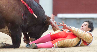Saúl Jiménez Fortes ha sido volteado hasta en tres ocasiones en el festejo celebrado este martes en Madrid, sufriendo dos cornadas. Según el parte médico firmado por el Dr. García Padrós, el malagueño presenta "dos heridas por asta de toro. Una en cara externa, tercio superior del muslo derecho con dos trayectorias, una hacia arriba y hacia adentro de 10 centímetros que alcanza el fémur y otra de 10 centímetros hacia abajo que causa destrozos en músculo vasto externo. La otra herida, también de 10 centímetros, alcanza la pala iliaca. Pronóstico menos grave. Se le traslada al Hospital Virgen del Mar".