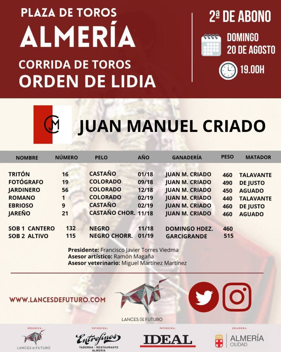 Seis de Juan Manuel Criado para esta tarde en Almería