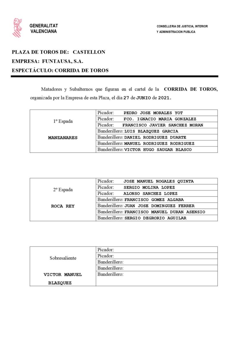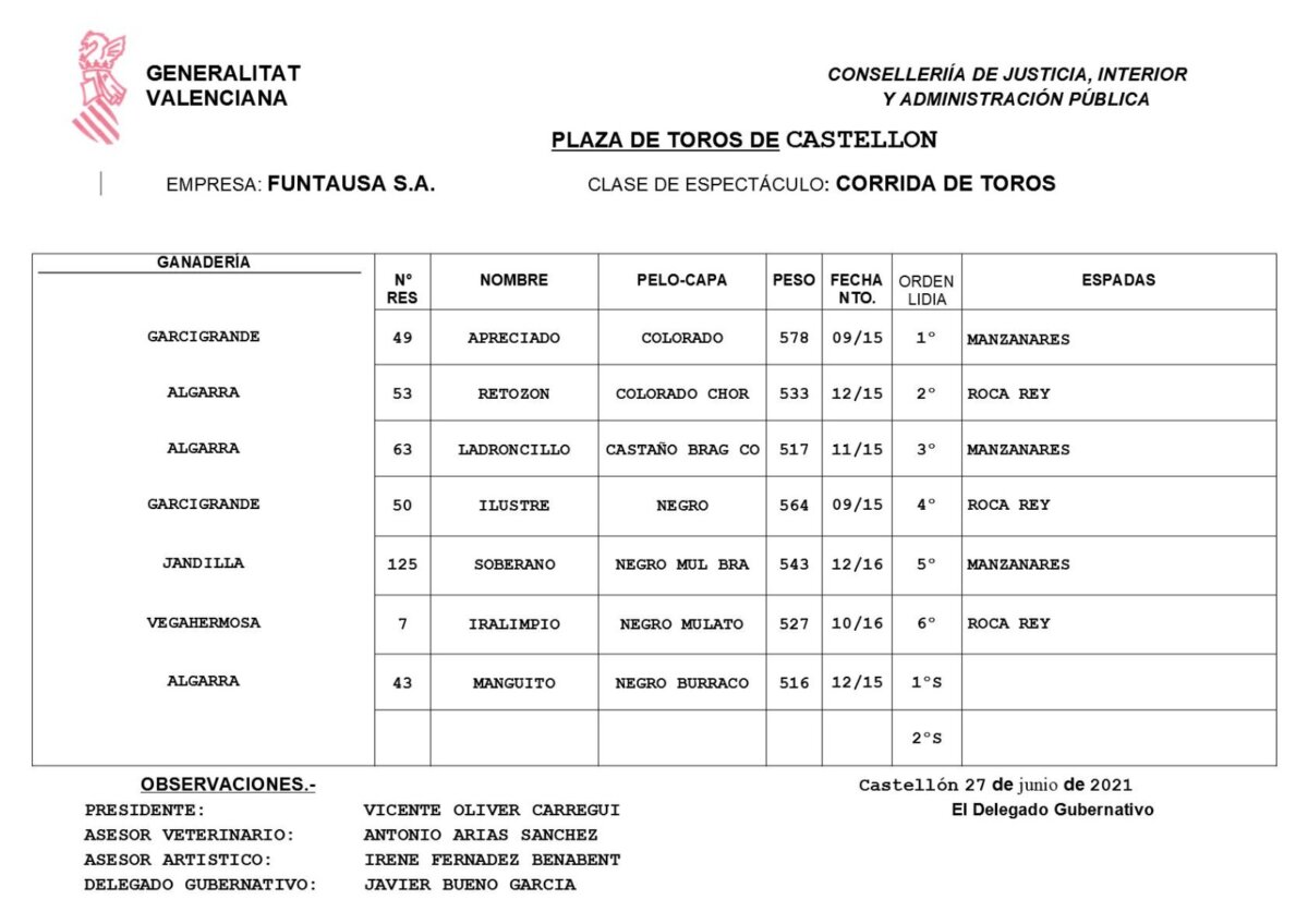 Sorteo de los toros de Jandilla, Luis Algarra y Garcigrande para Castellón