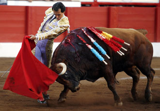 El Juli al final no se fue de vacío. Tras ser silenciado en su primera intervención, en la que no pudo brillar con un toro alto, feo, que se tapaba por la cara y que, para más inri, no quiso embestir, paseó un apéndice del colorado cuarto, un animal de mejores hechuras que descolgó y al que sólo le faltó un punto de transmisión. A pesar de ello, Julián le dio fiesta y, aunque no terminaba el toro de rebosarse en la muleta del madrileño, dejó notables pasajes dentro de un conjunto técnicamente perfecto. Mató de estocada trasera que bastó. En este toro, en tareas de brega, fue herido el subalterno José Antonio Galdón "Niño de Belén".