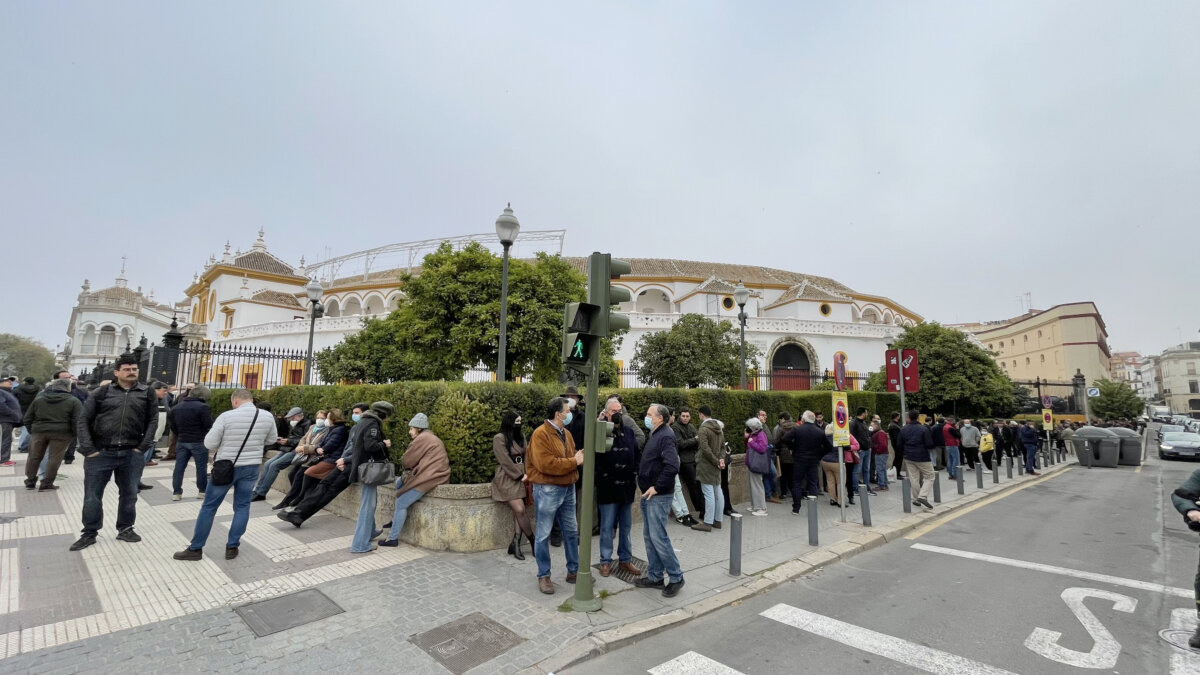La apertura de las taquillas de la plaza de toros de Sevilla para la venta de entradas sueltas volvió a congregar a cientos de aficionados en el Paseo de Colón y calle Antonia Díaz. Muchos aficionados se acercaron a la plaza desde la madrugada, formando largas colas que se mantienen durante toda la mañana y que demuestran la expectación generada por los carteles del Domingo de Resurrección y la Feria de Abril 2022.