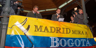 Enrique Ponce y Carlos Núñez han sido los encargados de leer un manifiesto en nombre del mundo del toro en la concentración que ha tenido lugar en la Plaza de Chamberí de Madrid en apoyo al toreo en Colombia. En el texto, que reproducimos íntegramente a continuación, se ha agradecido a los novilleros colombianos en huelga de hambre su lucha por la libertad de ejercer su profesión: "Han luchado como nadie lo había hecho hasta ahora por la Tauromaquia".