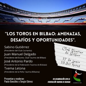 El Excelentísimo Club Taurino de Bilbao ha organizado un coloquio bajo el título "Los toros en Bilbao: amenazas, desafíos y oportunidades" para este jueves 17 de junio. El acto contará con la presencia del presidente del Club Cocherito, Sabino Gutiérrez; el presidente del Club Taurino de Bilbao, Juan Manuel Delgado; el presidente de la Federación […]