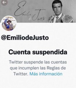 Twitter ha censurado la cuenta oficial de Emilio de Justo precisamente a falta de un día de su gesta con seis toros en Las Ventas. Una muestra más de la persecución a la que está sometida la Tauromaquia, que quieren silenciar en redes sociales. Según justifica Twitter, la cuenta del torero “incumple las reglas” de […]
