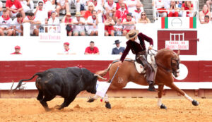 Hasta en tres ocasiones empleó el rejón de castigo Lea Vicens al recibir a Bravío, primer toro de la tarde con el hierro de Pallarés. Durante la lidia, la rejoneadora francesa empleó las banderillas tradicionales y las rosas, clavando estas últimas algo delanteras. Una lidia con eficacia que transmitió a los tendidos, pero aún más...