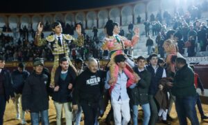 Los debutantes Sergio Sánchez y Tristán Barroso, junto con Carlos Domínguez, salen a hombros en la novillada inaugural de Olivenza; dos grandes novillos de Talavante