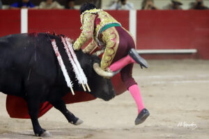 Recibió una espeluznante voltereta mientras toreaba a su segundo toro en Aguascalientes en la corrida del pasado lunes
