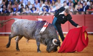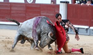 El joven espada fue cogido de forma muy fea al entrar a matar al segundo de la tarde; la herida penetra "fascia músculo sartorio, contundiendo arteria femoral superficial"