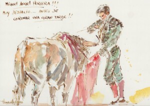 Una tarde más, el pintor peruano Humberto Parra plasmó su visión de lo que fue la cuarta de abono de la Maestranza de Sevilla. Su apunte de hoy ilustra el momento de perfilarse de Miguel Ángel Perera antes de coronar una gran obra, su Puerta del Príncipe; y el "tempo, tempo" de Borja Jiménez.