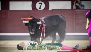 El novillero sevillano sufrió un feo derrote por el quinto novillo, cayendo mal a la arena; fue atendido de un "traumatismo craneoencefálico en observación más contusión extremo distal de la clavícula derecha"