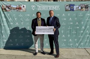 Frente a la puerta de la Real Maestranza de Sevilla, representantes del proyecto mantuvieron un encuentro con el doctor Luis Madero, de la Fundación de Oncohematología del Hospital Niño Jesús de Madrid, a cuya contribución se une con esta donación TauroCromos