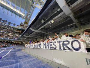 Los aficionados del equipo blanco desplegaron una pancarta en el partido celebrado este martes en el Santiago Bernabéu dándole ánimos al torero extremeño, todavía ingresado