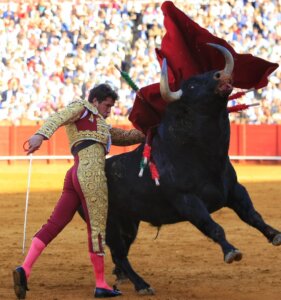 El francés fue prendido por la manga de la chaquetilla, siendo zarandeado con violencia y girando por completo su cuerpo prendido del pitón en una feísima voltereta